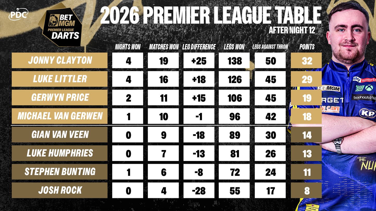 Premier Leaguen sarjataulukko on todella mielenkiintoinen torstain jälkeen, sillä kärkikaksikon takana käydään todella kova taisto. Esimerkiksi Luke Humphries ja Gian van Veen ovat tällä hetkellä kokonaan ulkona kärkinelikosta. Luvassa on siis jäätävä kilpailu finaalipaikoista, kun illat käyvät vääjäämättä väliin.